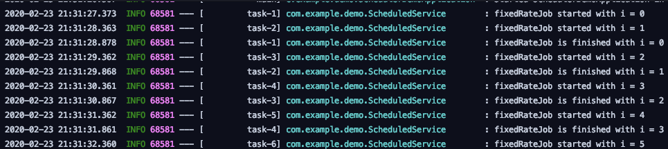실행 결과를 보면 fixedRateJob이 이제서야 정상작동하는 것을 알 수 있습니다. Async로 선언한 이후로, fixedRateJob이 "task-n"이라는 별도의 스레드에서 생성되고 있으며, 앞의 fixedRate가 아직 끝나지 않았더라도 새로운 task thread에 fixedRate를 넣어 실행시키고 있다는 것까지 확인할 수 있습니다.