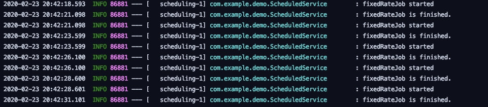 결과는 이렇습니다. 시간을 유심히 보시면 알겠지만, fixedRate = 1000으로 설정되어 있음에도 불구하고, 2.5초에 한번씩 실행되고 있다는 것을 확인할 수 있습니다. 그 이유는 Thread.sleep(2500) 때문인데요, 작업 수행 시간이 fixedRate를 넘겨버렸으므로 작업이 끝나자마자 다음 n초대를 기다리지 않고, 바로 다음 작업을 실행한 것입니다. 즉, fixedRate일 경우에 작업의 수행시간이 길어진다면, 주기적인 실행을 보장하지 못합니다.