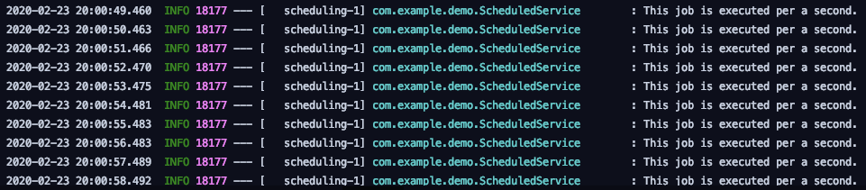 위의 Service는, 단순히 1초에 한번씩 로그를 찍는 메소드를 가지고 있습니다. 실제 로그를 보면, 정말로 1초에 한번씩 실행되었음을 확인할 수 있습니다. 이는 Scheduled에 같이 들어간 fixedDelay 프로퍼티가 1000으로 설정되어 있기 때문입니다. 눈치 채셨겠지만 이 프로퍼티는 ms단위이므로, 500을 넣으면 0.5초, 3000을 넣으면 3초에 한번씩 실행하도록 설정할 수 있습니다.