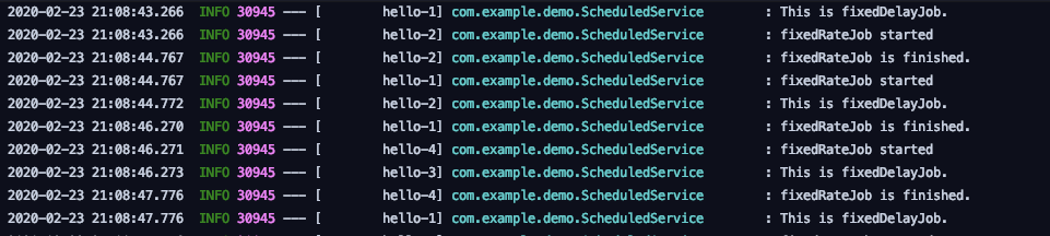 실행 결과를 확인해 보면, 이전에 scheduling-1 로만 표시되던 스레드가 hello-n으로 바뀐 것을 확인할 수 있습니다. 설정한 대로, 10의 size를 가지는 thread pool에서 작업들이 수행되게 된 것입니다. 그 결과, fixedDelayJob은 정상적으로 1.5초마다 실행됩니다.