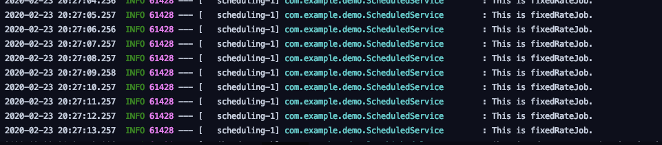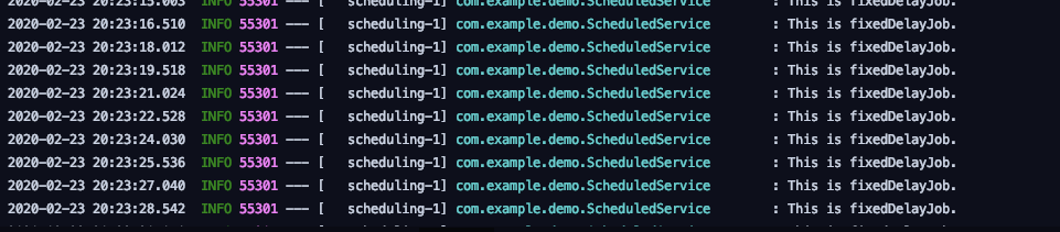 위의 Service는, 단순히 1초에 한번씩 로그를 찍는 메소드를 가지고 있습니다. 실제 로그를 보면, 정말로 1초에 한번씩 실행되었음을 확인할 수 있습니다. 이는 Scheduled에 같이 들어간 fixedDelay 프로퍼티가 1000으로 설정되어 있기 때문입니다. 눈치 채셨겠지만 이 프로퍼티는 ms단위이므로, 500을 넣으면 0.5초, 3000을 넣으면 3초에 한번씩 실행하도록 설정할 수 있습니다.