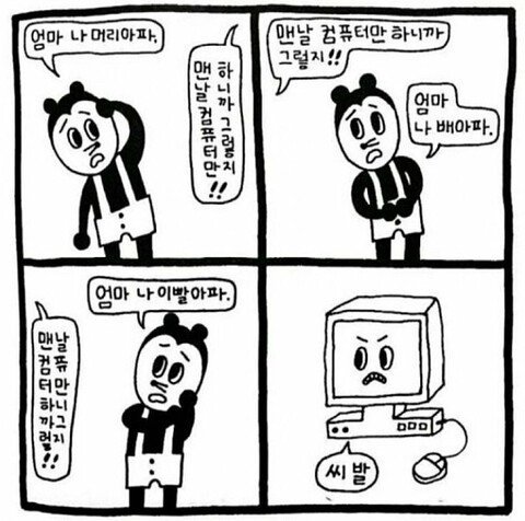 소싯적에 온라인 게임 좀 해봤던 분들은 부모님으로부터 비슷한 잔소리를 들었을 것 같다. "맨날 컴퓨터만 하니까 그렇지!!" 틀린 말은 아닌데, 계속 해서 듣다 보면 '잔소리는 됐으니까 병원이나 데려다 줘..' 하며 울컥하게 된다. 근데 고3 때 입시 스트레스로 배 아파서 한밤중에 응급실 갔다 왔을 때에는 왜 "맨날 공부만 하니까 그렇지!!" 안 해줬는지 궁금하다.