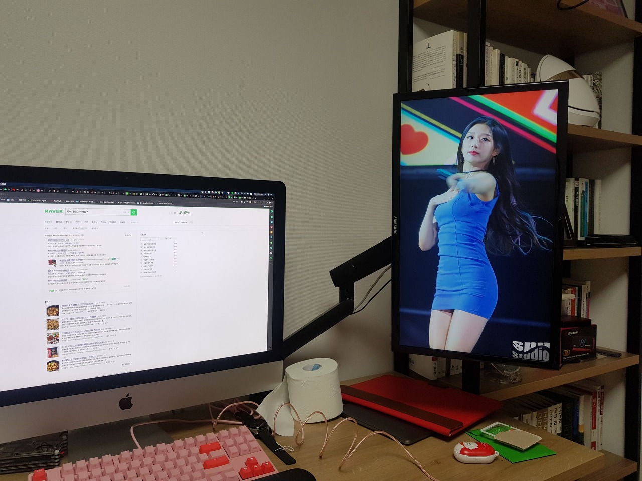 나는 기본적으로 듀얼 모니터 상태로 일을 한다. 회사에서 일을 할 때에는 서브 모니터를 볼 때 목이 아프진 않았는데, 집에서는 유독 보기가 불편하게 느껴졌다. 각도와 높이가 달라서 그런가? 하면서 아쉬운 대로 쓰고 있다가, 문득 모니터 암을 달면 목도 덜 아프고, 책상 공간도 확보가 많이 되지 않을까 싶었다. 그러나 정작 사고나니 모니터암 쓴다고 해서 목이 안 아프진 않았다. 대신 각도와 높이 조절로 통증 정도는 줄일 순 있었다. 그리고 뜻하지 않은 부수효과(?)가 있었는데, 바로 연예인 직캠 보기가 편해졌다는 것. 전국의 아이돌 덕후들. 빨리 모니터암 사라. 최고다.