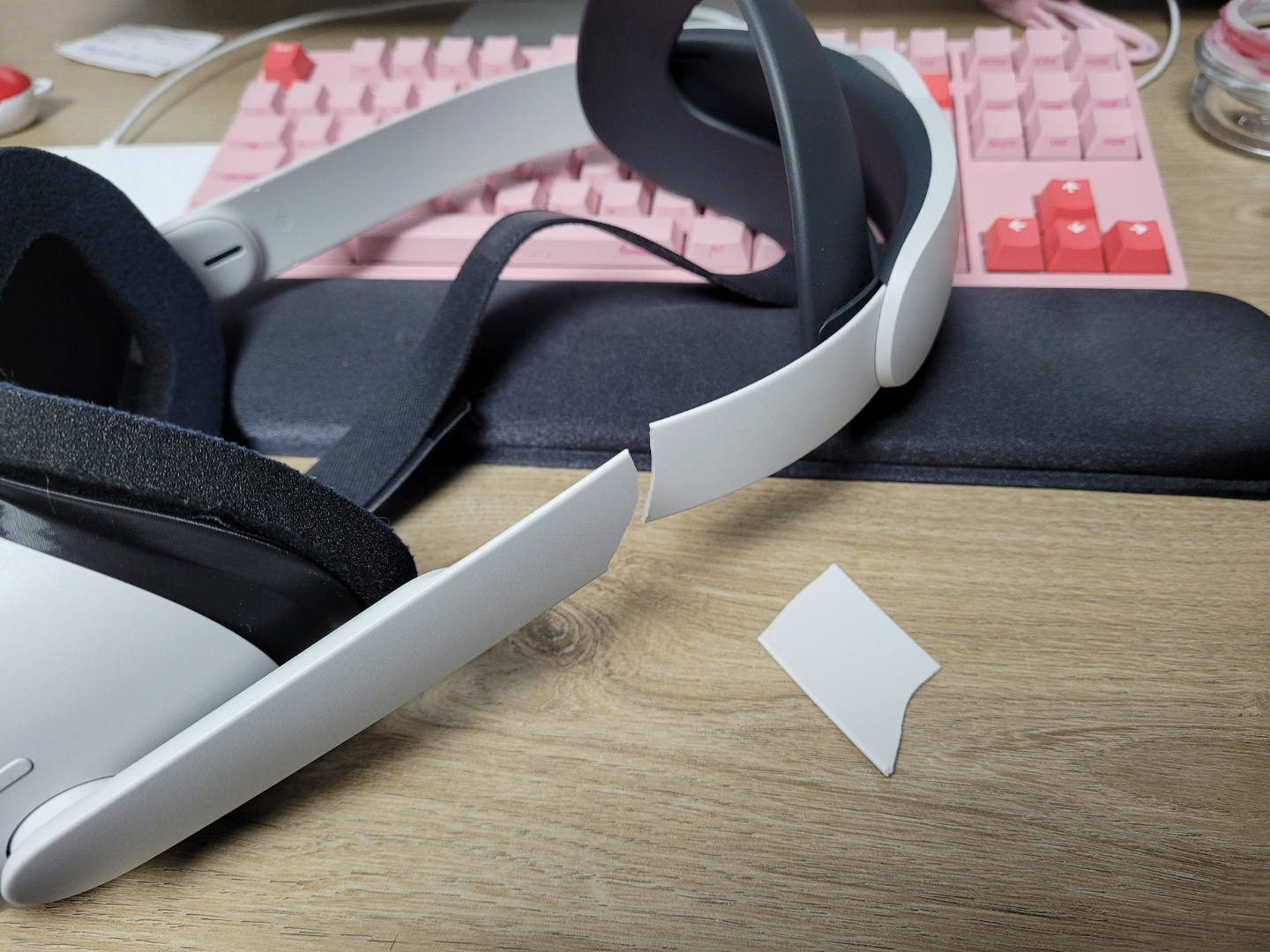 위에서 잠깐 언급했지만, 저가형으로 나오다보니 디테일은 많이 떨어지는 제품이다. 기본 스트랩은 조잡해서 엘리트 스트랩이나 다른 서드파티 스트랩을 찾을 수밖에 없고, 얼굴과 맞닿는 패드도 빛샘 현상이 신경쓰이면 결국 다른 대체재를 찾게 된다. 더군다나 엘리트 스트랩은 6만원씩이나 하면서 내구도는 처참하기 그지없다. 아래 사진은 이 글을 쓰자마자 부서진 내 엘리트 스트랩이다. 그나마 다행인 점은, 오큘러스 측도 내구성 이슈를 잘 알고 있어서 무상 교체 2년을 지원해준다는 점이다. 당분간 나는 새 제품을 받을 때까지 또 광대뼈 아픈 그 기본 스트랩을 쓸 예정이다. 하느님 맙소사..