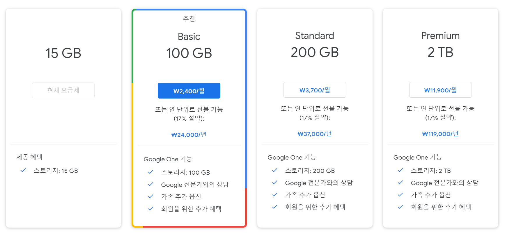 구글에서 제공하는 클라우드, Google One의 요금제입니다. 이 중 2TB 1년 결제시 119,000원의 요금이 듭니다.