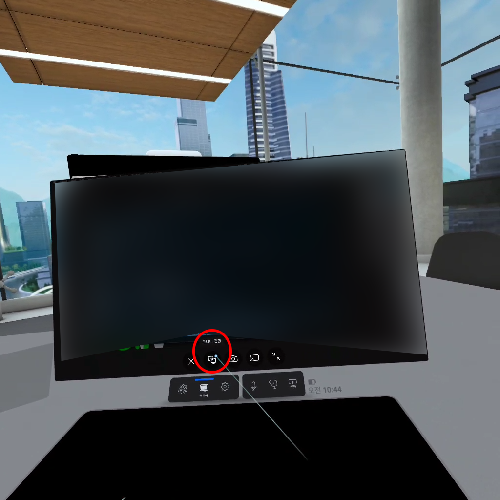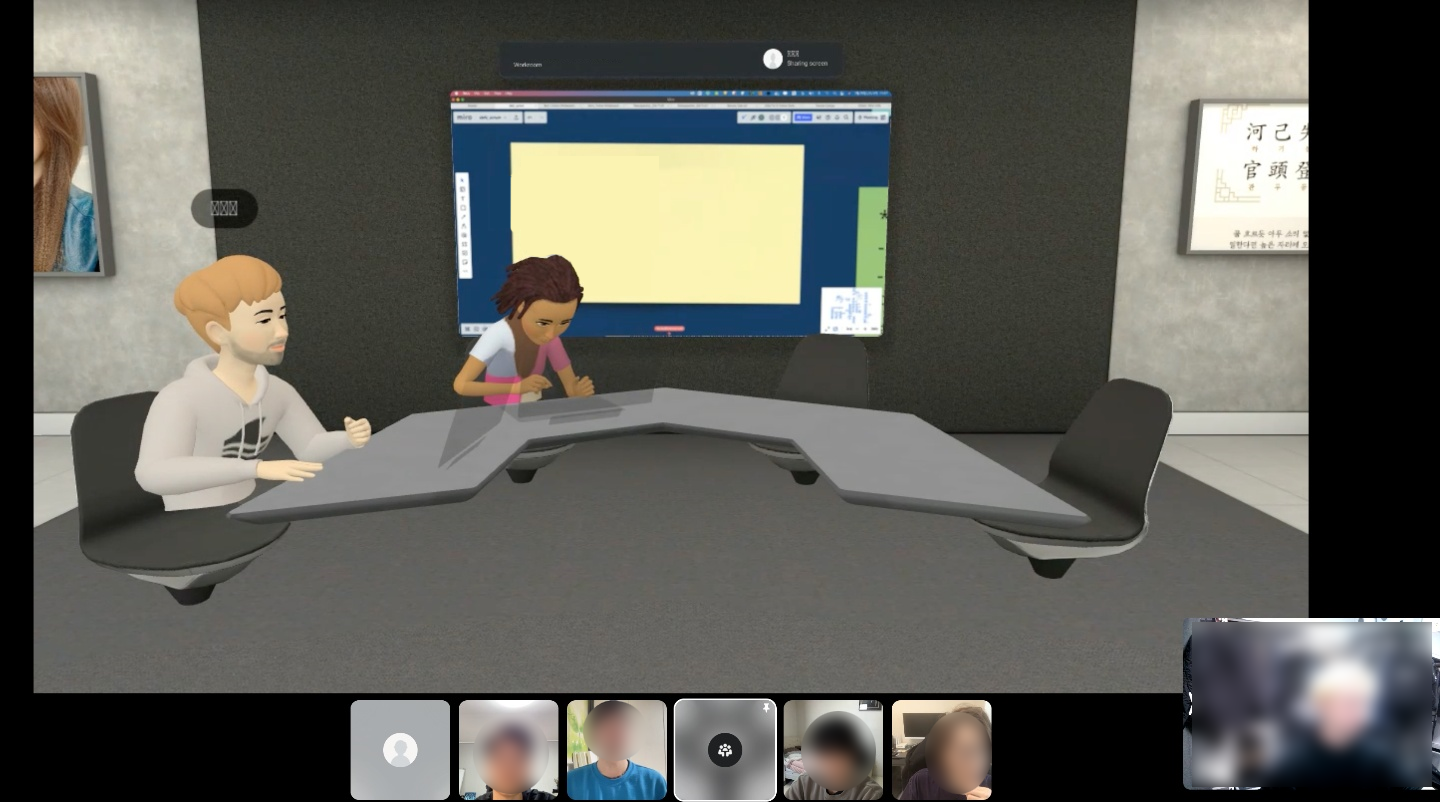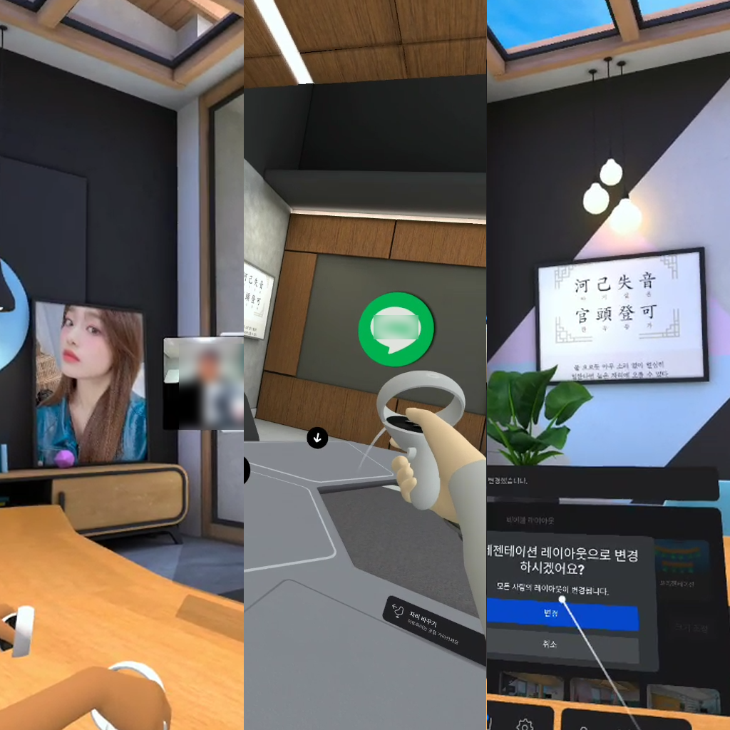대체로 다른 화상회의와 동일하되, 이렇게 VR 속 환경이 같이 보인다는 점이 차이점이다.