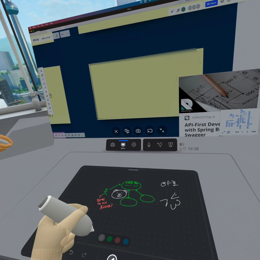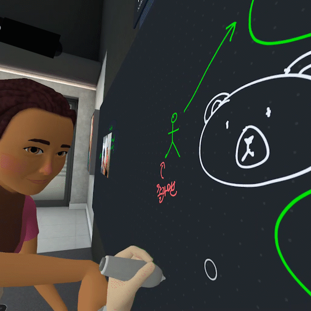 사실, 현재 워크룸의 기본적인 기능들은 줌에서 제공하고 있는 것들보다는 못 하다. 그러나 딱 하나, 워크룸이 다른 원격 회의 프로그램을 이길 수 있는 유일한 기능은 바로 이 "화이트보드" 기능이라 할 수 있다. 책상 근처의 빈 공간을 가상 화이트보드로 설정하고, 해당 영역에 컨트롤러를 뒤집어 펜처럼 사용하면 실제로 그림이 그려진다. 코로나 이전에 그러했듯이, 팀원들과 화이트보드를 같이 바라보고 그림을 그려가며 토론을 하는 것이 가능하다.