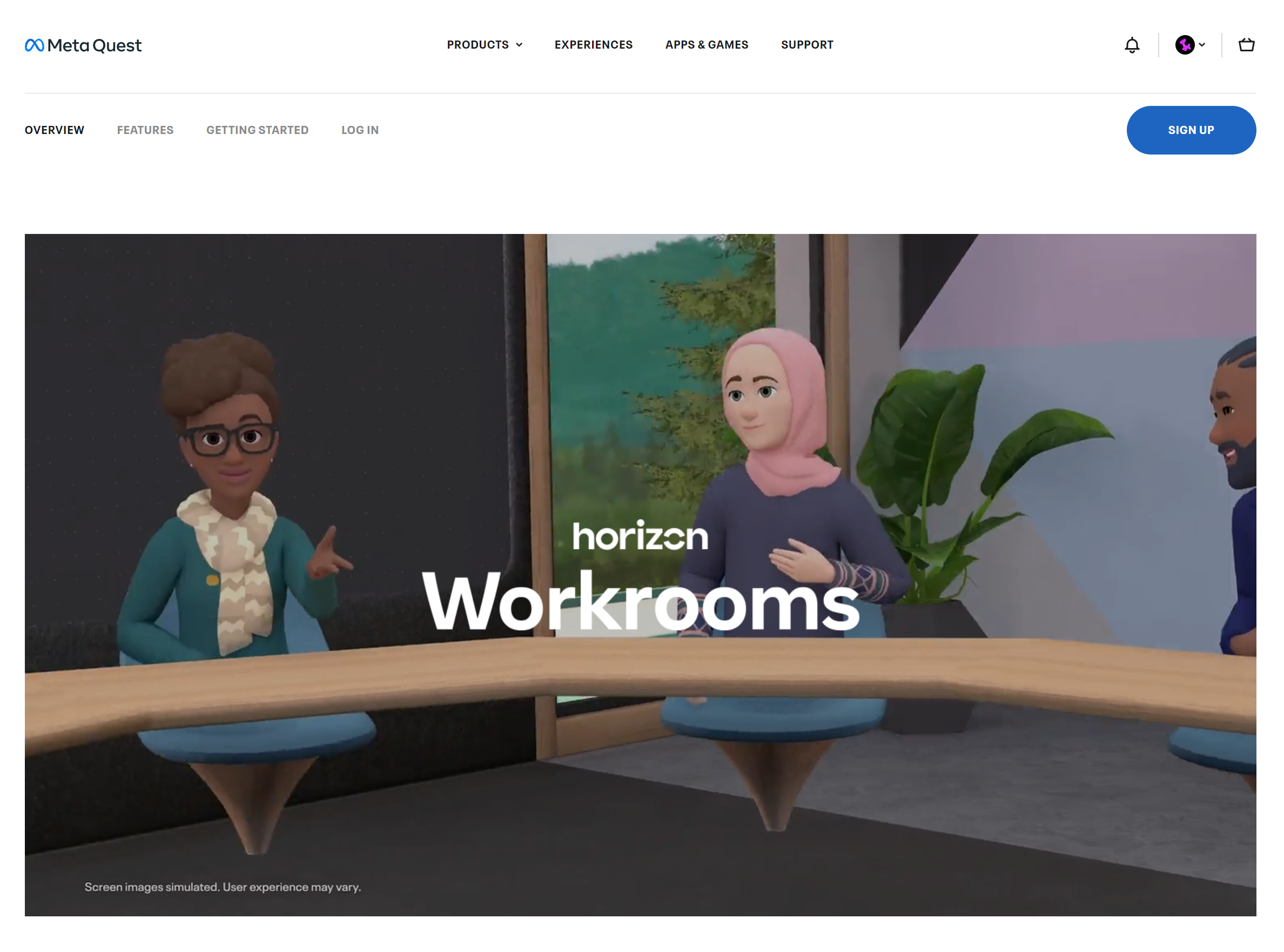 메타도 이 사실을 당연히 인지하고 있기에, 주기적으로 소프트웨어 업데이트를 행하고 있다. 몇 가지 시도들을 해보고 있으나, 그 중 나에게 가장 관심이 가는 것은 바로 "호라이즌 워크룸(Horizon Workrooms)"이었다. 호라이즌 워크룸은 VR 세계 속에서 다른 사람들과 업무 회의를 할 수 있게 해주는 앱이며, 21년 여름부터 오픈 베타를 실시하고 있다. 재택 업무 시대가 도래하면서 우리는 시간과 공간의 제약이 없는 유토피아적 업무 환경과 동시에 온기 없는 삭막한 직장을 다니게 되었다.