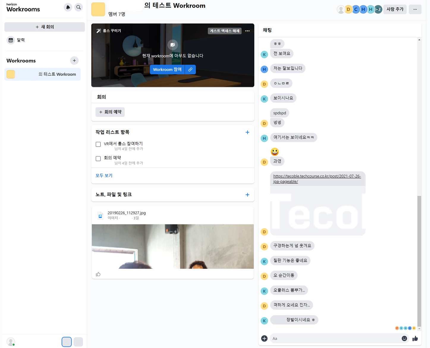워크플레이스를 생성하면 기본 Workroom이 하나 생성된다. 슬랙으로 치자면 이게 "채널"과 유사한 개념으로, 내부적으로 다른 워크룸들을 생성할 수 있다. 워크플레이스 내부에선 다른 그룹웨어들이 그러하듯이, 자료 공유나 스케줄 편성, 그리고 채팅이 가능하도록 되어있다. 그리고 제일 중요한 "워크룸 참여"가 있다.