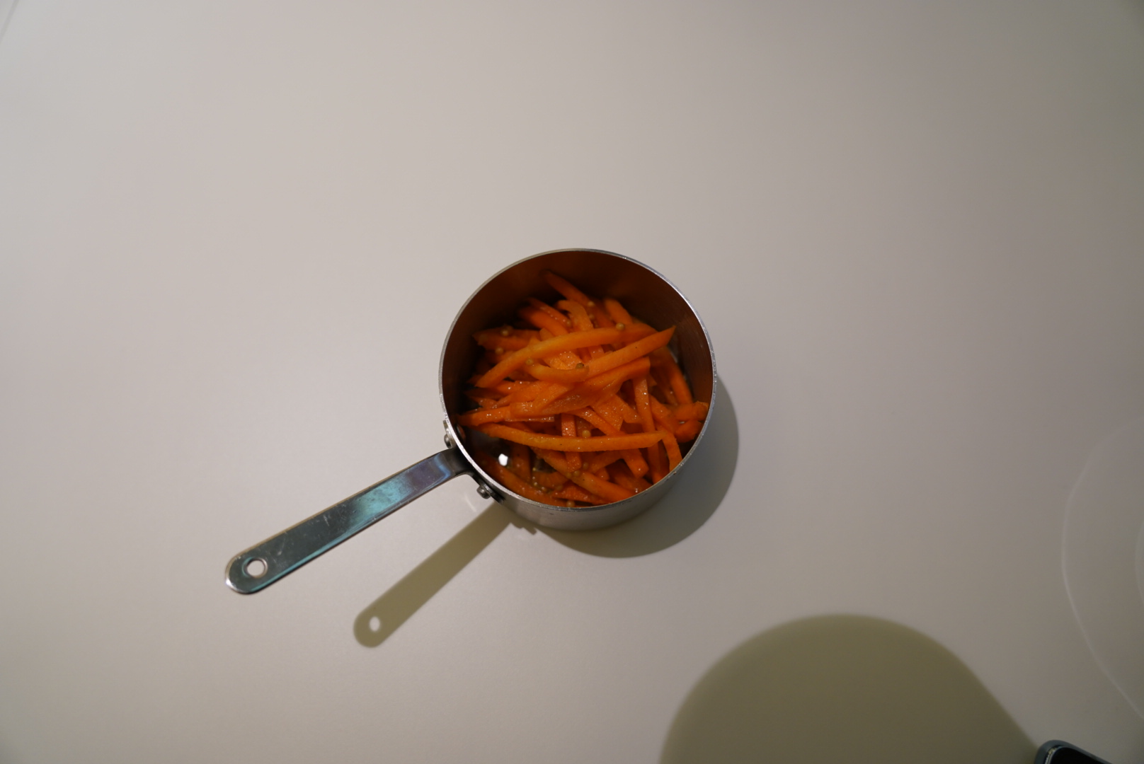 에피타이저로는 당근 라페(당근 피클)가 나온다. 이 또한 승우아빠 말로는 "이러면 리필 요청 안 하겠지 뭐" 이런 의도였다는 데 의외로 리필이 너무 많이 들어왔었다고 한다. 먹어보니 오이 냉국같은 맛이 났는데, 우리는 리필을 하지 않았다.