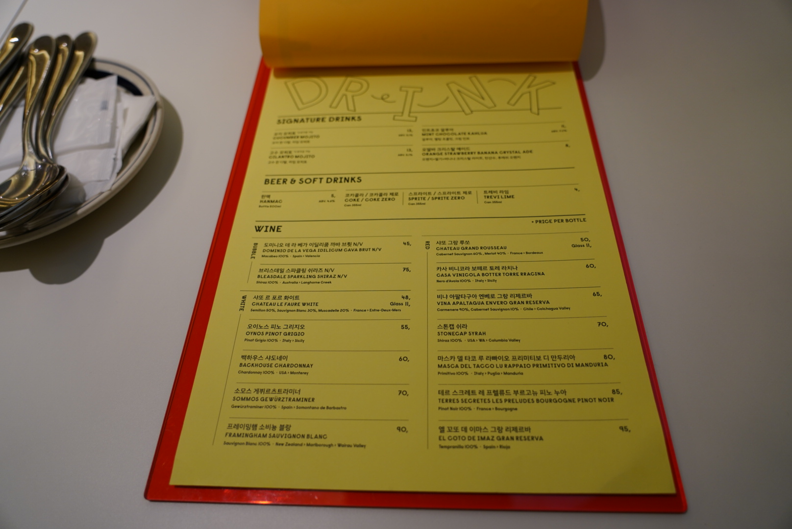 자리에 앉아서 메뉴를 골랐다. 리뷰에서는 "양이 좀 되기 때문에 적게 시켜야 한다"는 평들이 좀 보였다. 그러나 우리는 "기껏 힘들게 예약해서 왔는데 이왕 온 김에 다양하게 먹어보는 게 낫지 않나?" 싶은 생각에 1인 1메뉴를 했다. 우리의 픽은 마이야르 스테이크, 통골뱅이 냉파스타, 소보로 파스타였다.