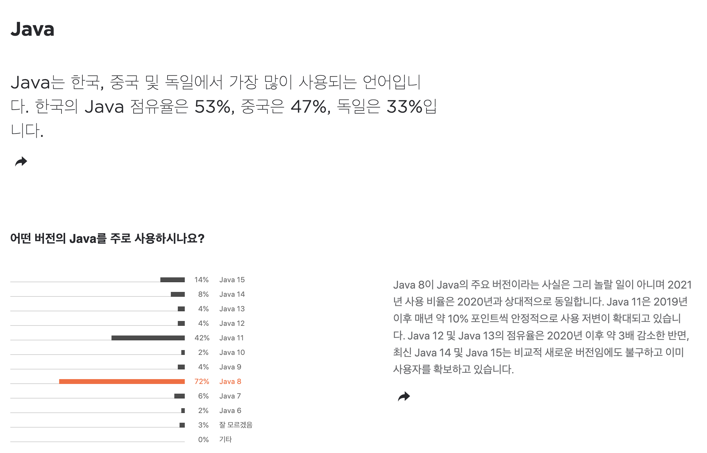 반면, 자바의 역습 또한 기대해볼만 하다 생각합니다. 이 글이 마치 코틀린은 신문물/ 자바는 구세대 유물처럼 보이도록 쓰여진 느낌을 받으셨을 수도 있겠는데요, 이는 제가 비교 대상을 2014년에 릴리즈된 "자바 8"으로 잡았기 때문입니다. 이후 자바는 17까지 버전이 올라가면서 이 글에서 언급된 "자바의 단점"을 꾸준히 개선해왔습니다. 하지만 이 글을 읽으시는 독자분들도 "최신의 자바"가 얼마나 발전했는지에 대해서는 감이 잘 안 오실 듯합니다. 왜냐하면 아직까지도 전세계에서 가장 많이 쓰이는 자바는 8 버전이기 때문이죠.